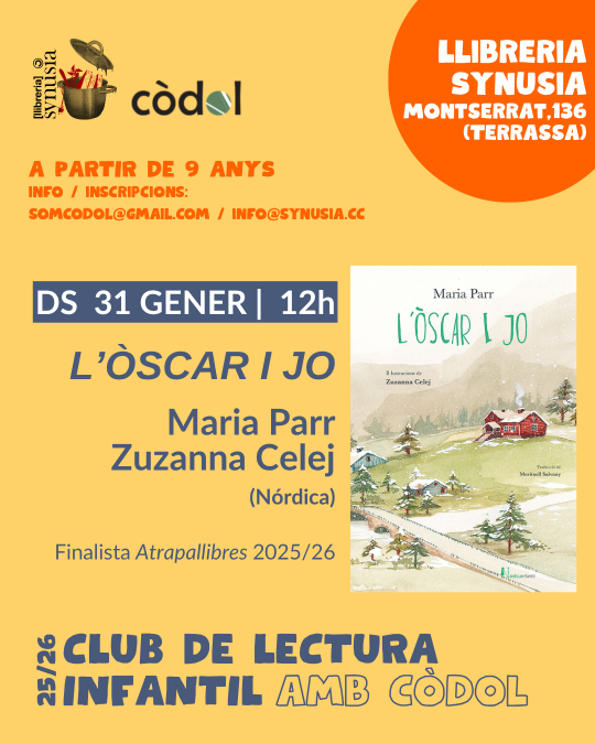 El grup Còdol i la Llibreria Synusia us convidem a la segona sessió del Club de lectura infantil del curs 2025/26 el pròxim 31 de gener a les 12h. La sessió es centrarà en el llibre L'Óscar i jo de Maria Parr i Zuzanna Celej (editat per Nórdica) (Finalista Atrapallibres 2025/26)