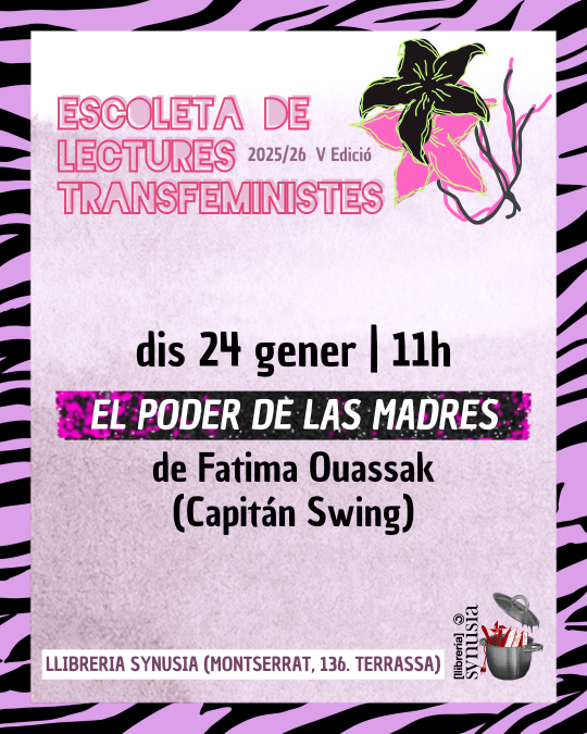 La llibreria Synusia us convida a la primera sessió de l'Escoleta de Lectures Transfeministes del curs 2025/26 que celebrarem el pròxim dissabte 24 de gener a les 11h.