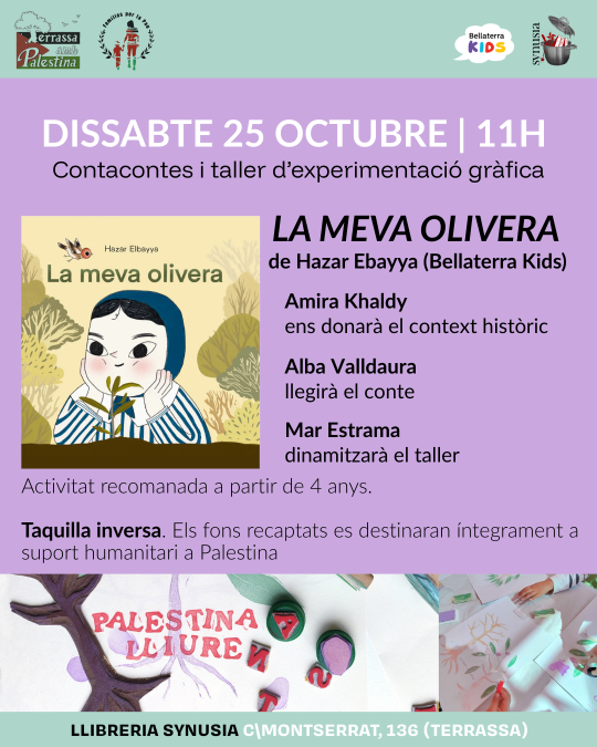 La llibreria Synusia i Bellaterra Kids us convidem a un contacontes - taller sobre el llibre La meva olivera de Hazar Elbayya (editat per Bellaterra Kids). Serà el pròxim dissabte 25 d'octubre a les 11h i està organitzat en col·laboració amb Terrassa amb Palestina i Famílies per la pau