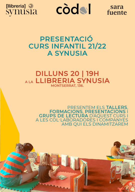 El proper dilluns 20 de setembre, a les 19h, la Llibreria Synusia us convida a la presentació del Curs infantil 21/22. En aquesta trobada exposarem les dates, horaris i formats de les diferents activitats pensades i dirigides a la canalla i a les seves famílies: laboratoris literaris, grups de lectura, tallers literaris i presentacions de llibres infantils i juvenils. Durant la trobada ens acompanyaran les companyes del grup Còdol, educadores i narradores, i la nostra companya Sara Fuente, bibliotecària i dinamitzadora de tallers infantils.