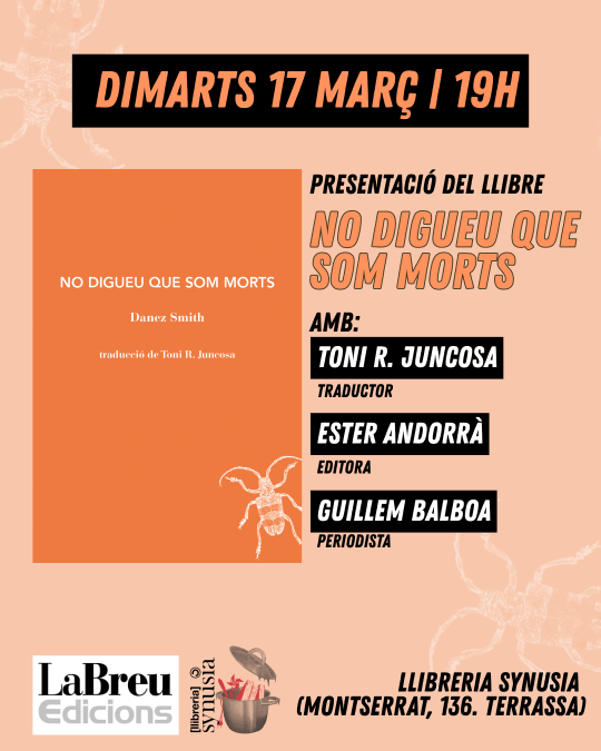 La llibreria Synusia us convida a la presentació del poemari No digueu que som morts de l'autor Danez Smith el pròxim dimarts 17 de març a les 19h. Per a la presentació ens acompanyaran Toni R. Juncosa, traductor del llibre, Ester Andorrà, editora de La Breu Edicions i Guillem Balboa, periodista.