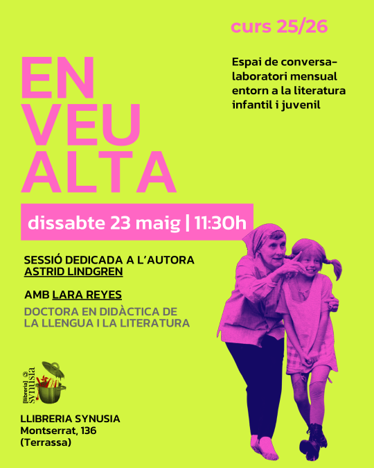 La pròxima sessió serà dissabte 23 de maig a les 11:30. En aquesta ocasió ens acompanyarà Lara Reyes i amb ella parlarem de l'obra d'Astrid Lindgren, autora entre d'altres, de l'icònic personatge Pippi Landstrum.