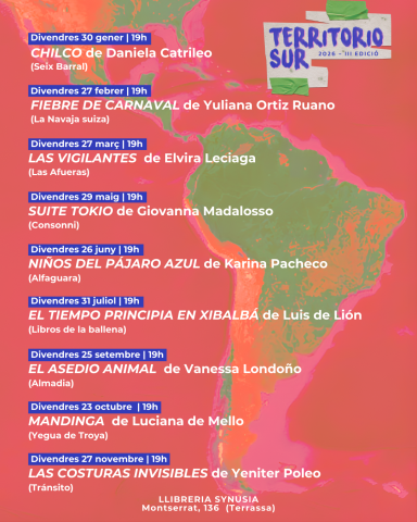 Enguany llegirem Daniela Catrileo, Yuliana Ortiz Ruano, Elviara Leciaga, Giovana Madalosso, Karina Pacheco, Luis de Lión, Vanessa Londoño, Luciana de Mello i Yeniter Poleo. Coneixerem les seves obres, els seus recorreguts i llegirem un dels seus llibres concrets. I sí, com cada divendres per a finalitzar la trobada, us proposem un clàssic de Territorio sur llegir fragments del llibre en veu alta.